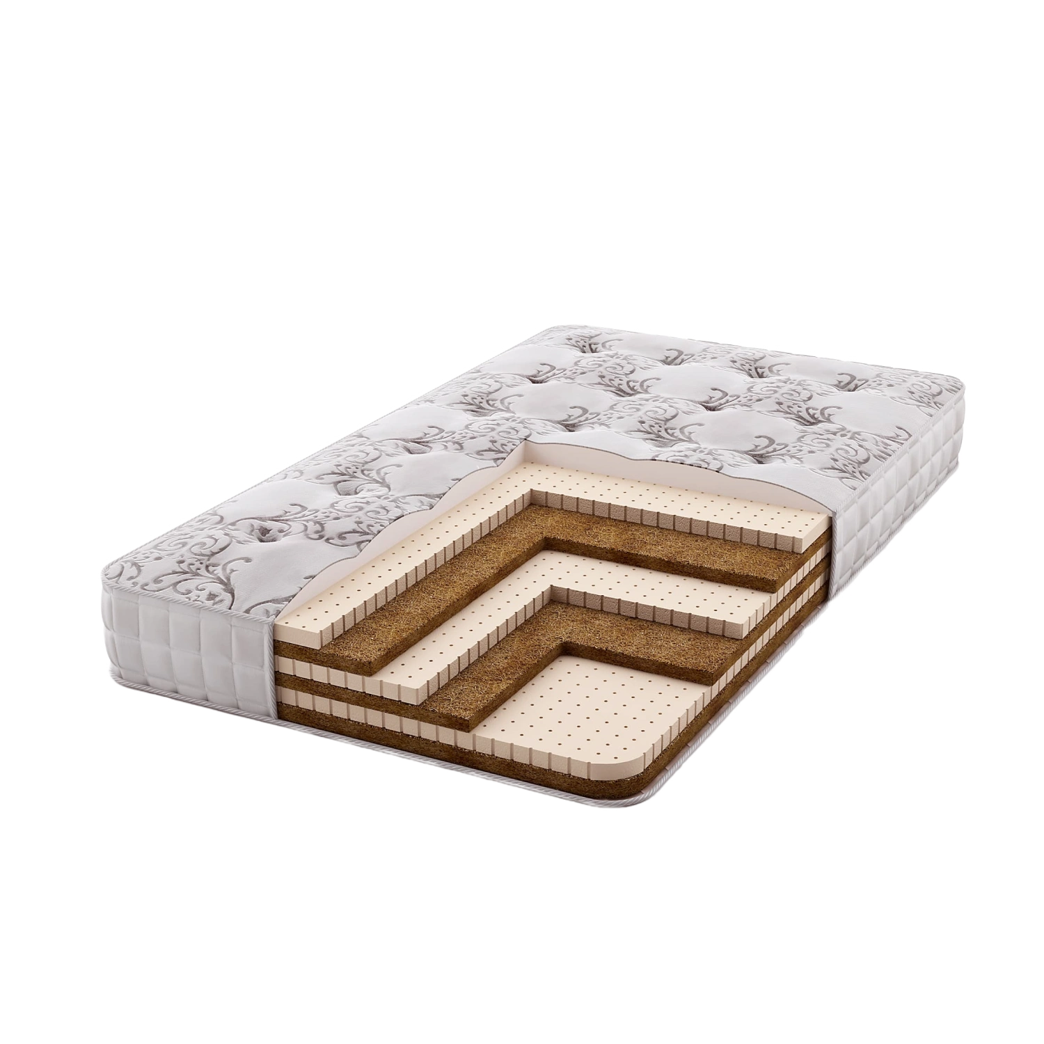 Беспружинный матрас с разной жесткостью сторон, основой которого служит сочетание чередующихся слоев используемых экологических материалов, латекса и кокосового полотна. Объединяя в себе достоинства этих двух компонентов, беспружинный матрас оказывает хорошую поддержку позвоночнику, обеспечивая условия для спокойного сна.